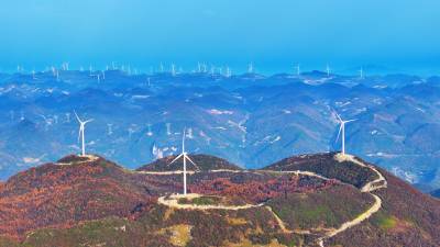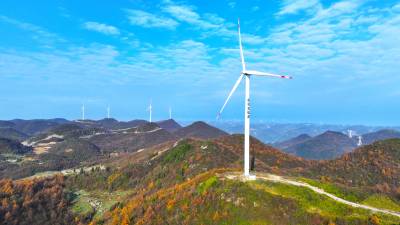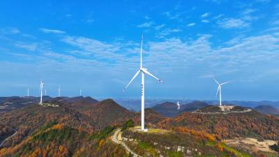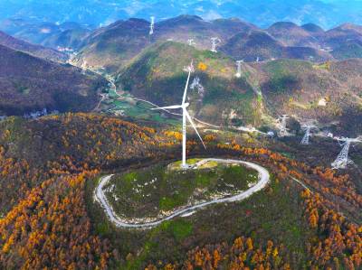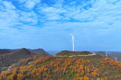 2024年11月16日,湖北省恩施土家族苗族自治州恩施市板桥镇大山顶村,一台台风力发电机矗立在群山之间。 近年来,湖北省恩施土家族苗族自治州恩施市积极践行生态文明建设理念,坚持生态优先、绿色发展,充分利用高山丰富的风力资源,大力发展风电清洁能源产业,实现生态效益和经济效益双赢,助推乡村振兴。(视界网 张远明 摄)