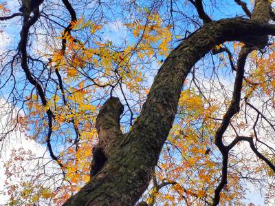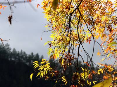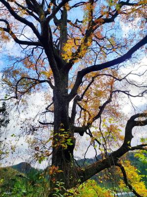 11月20日,尽管已经入冬许久,但是挺立在竹山县竹坪乡宽坪村的一棵拥有490多年树龄的黄连古木上,七彩的树叶却不肯飘落。那是对秋的眷恋,要把最美的风采长久地留给人间。深褐色的树干、虬形的树枝、彩色的树叶,构成了精美的水彩画卷。(视界网 张云朝摄)