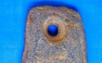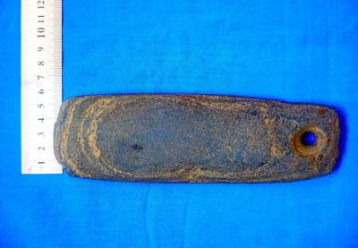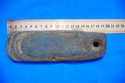近日,笔者在十堰市郧阳区五峰乡红椿沟村摄影采风时看到一户村民用绳子拴小猫拖着石片很象石器,捡起来一看很像是古代古人石斧。这决石片上部有一个人工钻孔,下边是人工打制的刃片,并有使用过的痕迹。后经尺子测量,这枚石斧长19.5公分,宽6.5公分,厚2公分,上部钻孔窟眼直径1公分。经网上查阅和郧阳博物馆工作人员鉴定为古代古人使用过的石斧,具体是什么年代?还需要全权威专家鉴定。这位老农告诉笔者,他是在20多年前在山下汉江河滩上捡到的,感到这个石片有一个窟窿眼很稀奇,就拿回家放在家里。现如今在拴刚抓回来的小猫。经笔者初歩告诉老农后,老农才知这是古代古人用过的石斧。