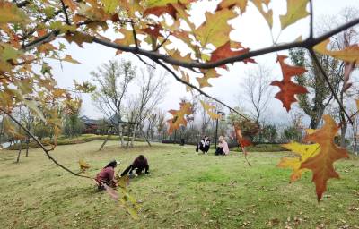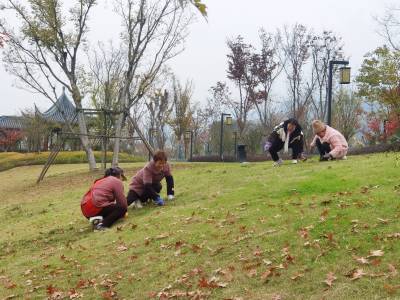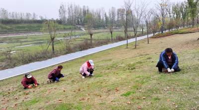 2024年11月23日,十堰市房县大河城关镇三海村段河流湿地“口袋公园”,园林工人忙碌着挖根拔掉草坪中的杂类植物。