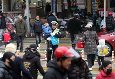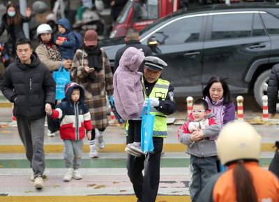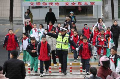 2024年11月25日,在湖北省钟祥市机关幼儿园门前,一位老交警利索地抱起孩子护送过马路。
