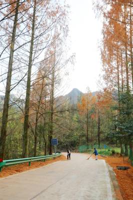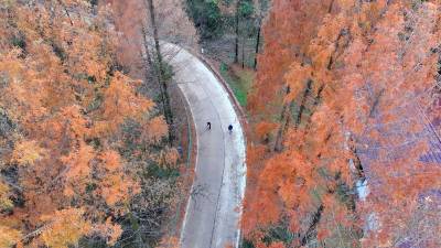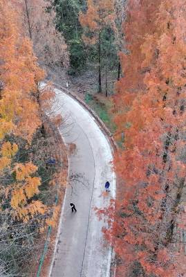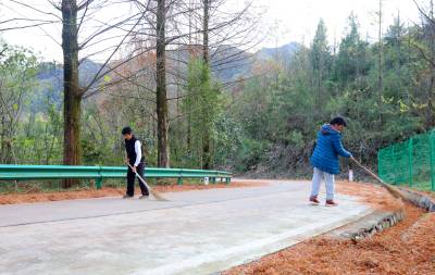 2024年11月25日,十堰市房县红塔镇沙坪村乡村公路,当地农民护路员在打扫路面飘落的树叶。