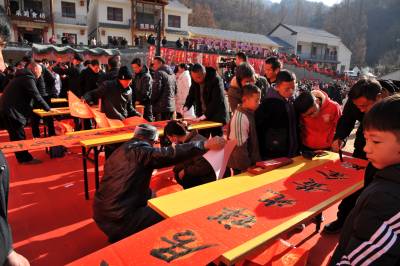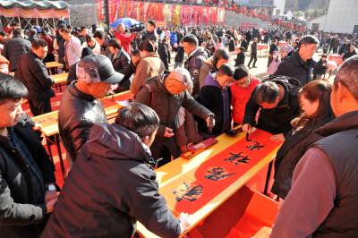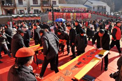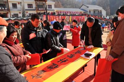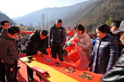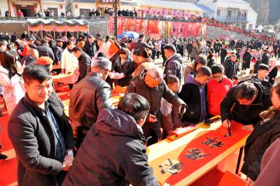 1月11日,神农架林区书法家们在阳日镇在钱家湾村举办“乡村年货集 寻味阳日湾”活动中,现场为赶集村民书写对联350多幅,免费赠送给村民。 易先骏摄影报道