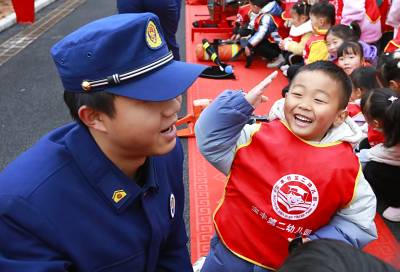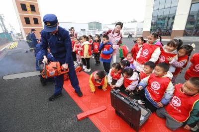 “小朋友,你们知道怎么使用灭火器吗?”“遇到火情时,我们应该做哪些事情呢?”“火警报警电话是多少?”“这个设备叫无齿锯,是一种高效、便携、安全的紧急救援处理工具,非常适合在救援现场快速切割各种金属材料,如防盗门和防盗窗等。”“你们平时到游乐场或者商场游玩时,尽量不要进入空间狭窄的通道,同时与容易引发危险的设备保持安全距离。”……消防员用通俗易懂的语言,耐心细致地向孩子们讲解消防知识及不同消防救援器材的名称及用途。