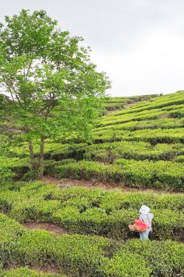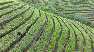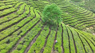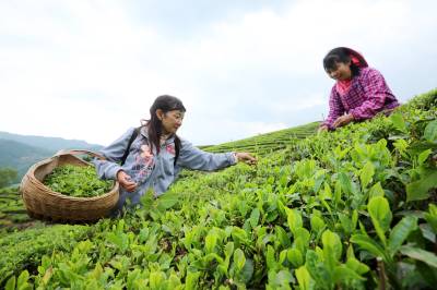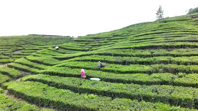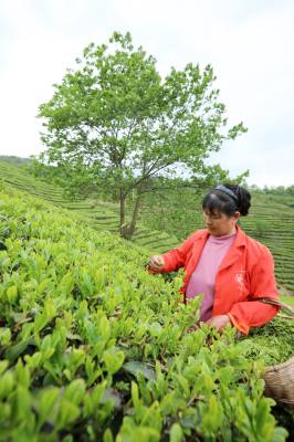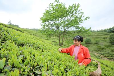 2025年4月21日,十堰市房县青峰镇张家河村1000多亩高山富硒茶园基地,当地农民在茶园采收春茶。