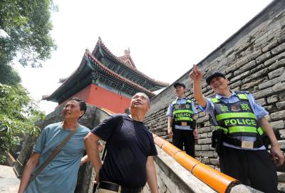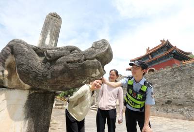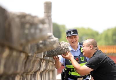2025年5月13日,在世界文化遗产湖北省钟祥市明显陵,钟祥市公安局皇庄水陆派出所民警在巡查过程中化身“导游”,一边热情地为游客介绍明代皇家陵寝的独特魅力,一边积极宣传新修订的《中华人民共和国文物保护法》知识。