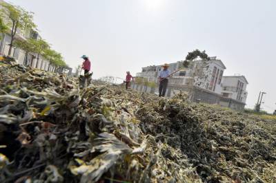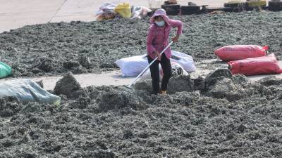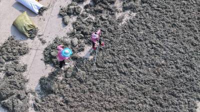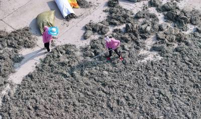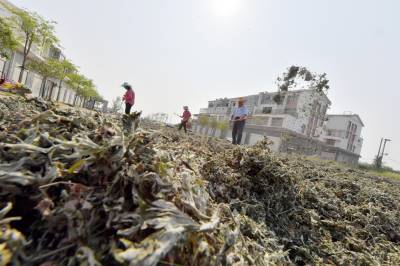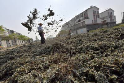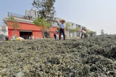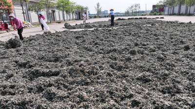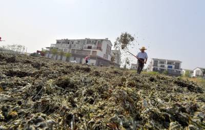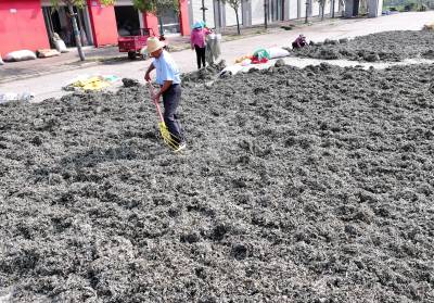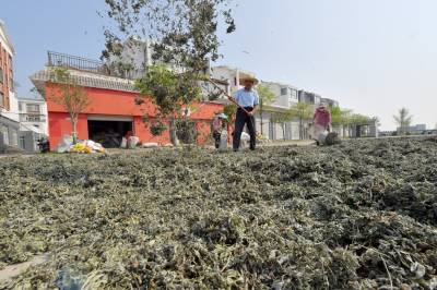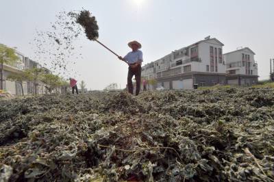 5月26日,在湖北省襄阳市南漳县九集镇旧县铺村,农民在抓住晴好天气晾晒艾草。端午节临近,正是艾草收获的季节,来自湖北黄冈的孙勇在南漳收购艾草,据他介绍,从去年开始,他在这里收购千吨艾草,供应医药生产厂家。目前今年的艾草收购刚刚开始,他近几天收购了几十吨,艾草来自南漳、宜城、襄城等地。