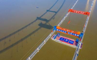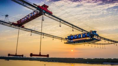 湖北武汉:双柳长江大桥主梁首节钢箱梁架设完成(APP已采)