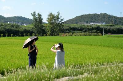 2025年7月30日,宜昌市夷陵区分乡镇南垭村青葱的稻田风光吸引游客打卡拍照。夷陵以农业为“媒”,为全域旅游聚拢更多人气,分乡镇紧扣“生态净土 农旅分乡”发展定位,探索农文旅融合与农业产业转型升级发展路径,助力乡村振兴。