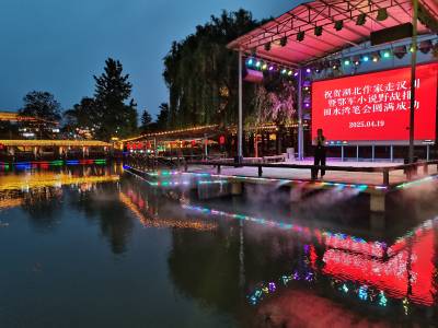 就在这时,一起参加笔会的汉川作家们点歌祝贺笔会圆满成功。悠扬的歌声在夜空中飘荡,如同一股温暖的春风,吹散了所有的疲惫。接着,本地美女作家李超华走上对岸的舞台献歌,她的歌声深情而婉转,每一个音符都饱含着对文学的热爱与对这场笔会的祝福。歌声将晚宴的气氛推向了高潮,大家纷纷起身鼓掌,欢呼声和掌声在湖畔回响。