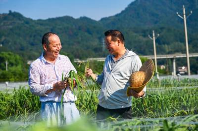 2025年9月16日,在湖北省黄冈市英山县农场管理中心满溪坪良种场“稻蛙共生”绿色种养试验基地,农业专家查看水稻生长情况。该试验基地是由黄冈市农科院自选黄科香六号水稻品种,套养农田稻蛙,利用稻蛙天然捕食能力控制害虫数量,同时蛙类的排泄物又能为水稻提供有机肥料,促进稻谷的生长和品质提升,从而减少稻田中农药、化肥的使用。据预测,今年可实现亩产水稻950斤,稻蛙1200斤,亩实现纯收益5200元。