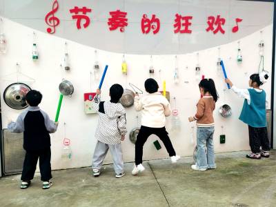 活动中,孩子们化身“小小音乐家”,用木棍敲击着音乐墙上的“乐器”,时而急促,时而轻快,每一次敲击都充满力量,每一次敲击他们都随着“旋律”快乐地蹦跳起来。有的左手敲击着矿泉水瓶,右手敲击着不锈钢锅盖,沙沙声如同细雨洒落,咚咚声酷似进军战鼓,交织成独特的旋律,稚嫩的乐曲声在校园飞扬。
