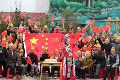 湖北沙洋:“寿星”与国旗共绘“家国同庆”画卷