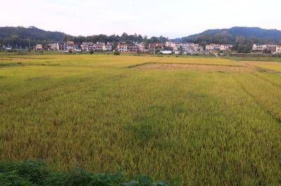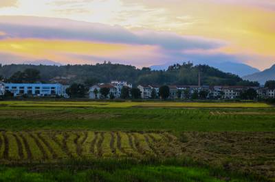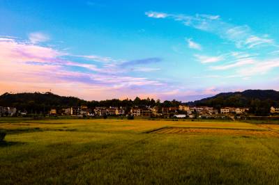 2025年9月30日,在湖北省英山县方家咀乡望天畈村农村公路边,翠绿成排的重点保护树木--枫杨高大挺拔,靓丽多姿,连绵的翠绿守护着丰收的田野,与天边彩霞及金黄的的稻谷,构成一幅秋日和美乡村新画卷。