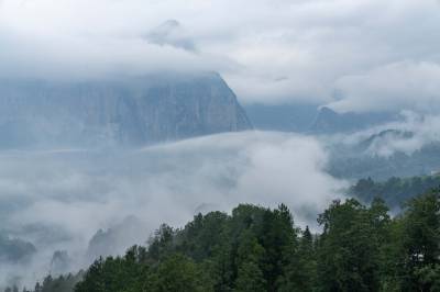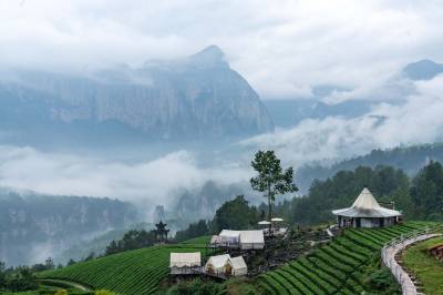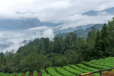 云蒸雾绕的湖北巴东绿葱坡山腰