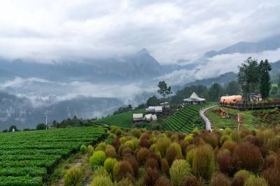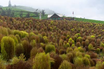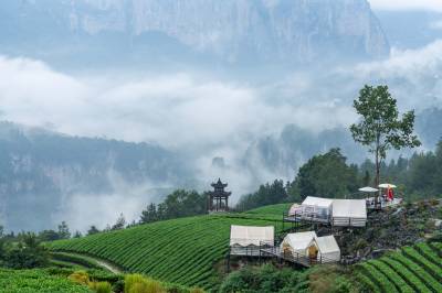 湖北恩施:云雾峡谷茶园地肤草景观成国庆网红打卡地
