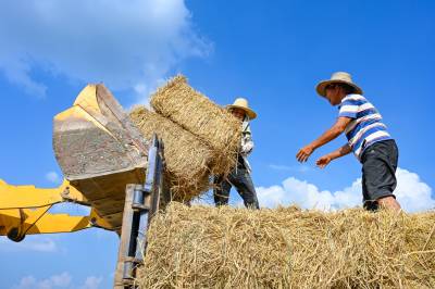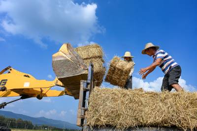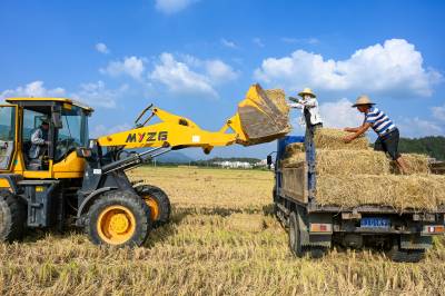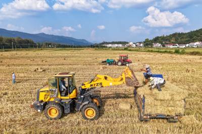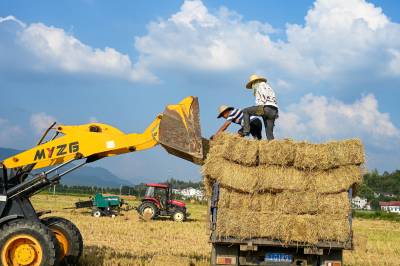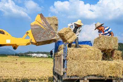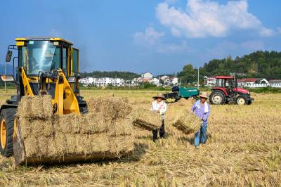 2025年10月9日,湖北省黄冈市英山县金家铺镇高标农田里,雄飞专业合作社农机手驾驶农机正在装运稻谷秸秆。秋收时节,湖北省英山县加大水稻秸秆回收力度,将秸秆广泛用于菌材、饲料、滑雪场草垫等用途,既保护生态环境,又有效增加了农民收入,让秸秆变废为宝。