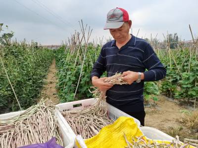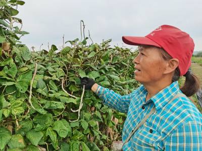 千亩蔬菜基地,成片种植的秋豇豆长势喜人,一排排支架上挂满了翠绿的豇豆,豇豆垂条细长、豆粒饱满。分散在基地各处采摘豇豆的群众手法娴熟,不一会儿,背在身上的大包就装满了长长的豇豆。联合村达海蔬菜专业合作社采用“玉米+豇豆+菜薹”三茬连作栽培模式,年产各类蔬菜6000万斤,年销售额5000余万元。