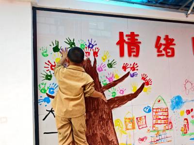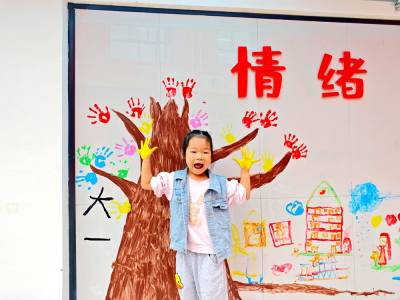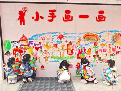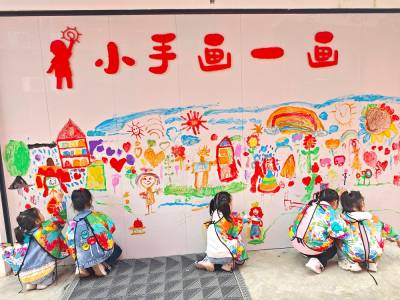 涂鸦墙的画面中,一棵“成长树”格外醒目。孩子们将蘸满颜料的小手按在墙上,一个个色彩各异的手掌印化作了大树的繁茂枝叶,象征着孩子们在幼儿园的滋养下茁壮成长。树下的房子,是孩子们心中幼儿园的模样——明亮的教室、宽阔的操场,处处透着温馨。