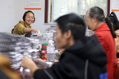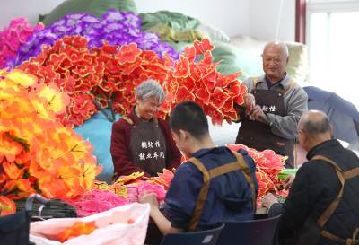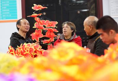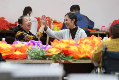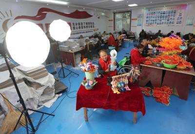 2025年10月14日,在湖北省荆门市圆梦残疾人庇护工场,41名残疾工友正在赶制电池盒卡纸和绢花加工订单,现场一派繁忙而充满活力的景象。