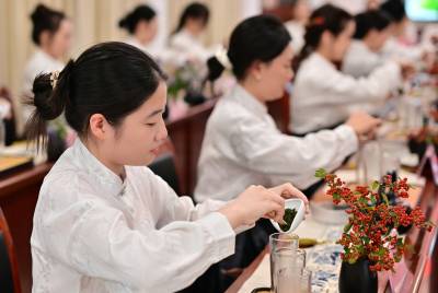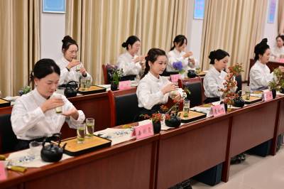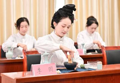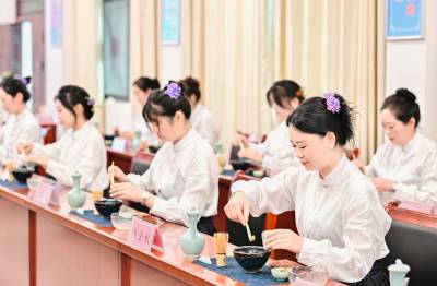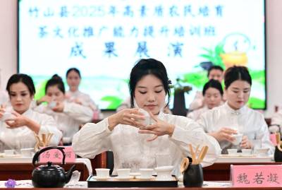 10月15日,竹山县“高素质农民培育茶文化推广能力提升培训班”培训成果展演会上,学员们表演了绿茶、红茶、乌龙茶等多种茶叶冲泡、品鉴、奉茶技艺和宋代点茶“行礼、调膏、七汤点茶、作画、品饮、谢礼”主要环节,典雅的装束、娴熟的技艺、周到的礼仪让人赏心悦目,备受尊崇的美感油然而生。