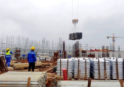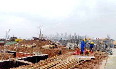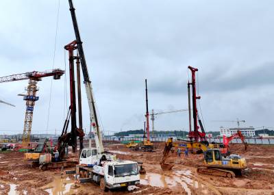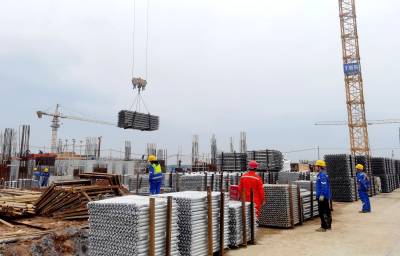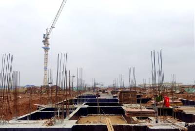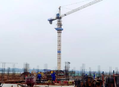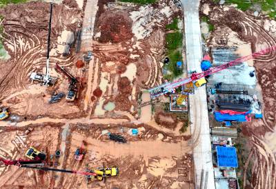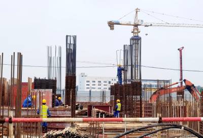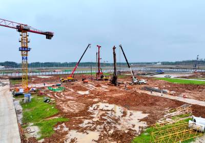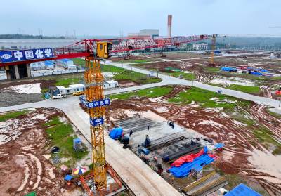 2025年10月18日,在兴发保谷磷化工产业园施工现场,塔吊林立,货车穿梭,一派热火朝天的建设景象。