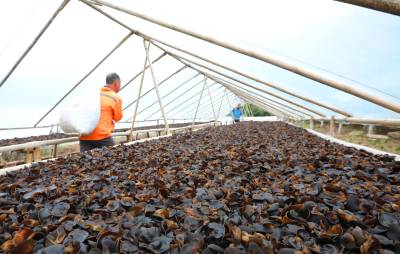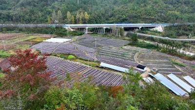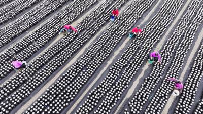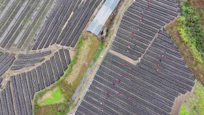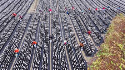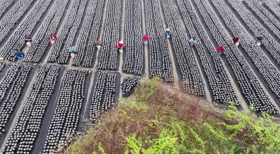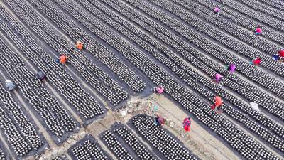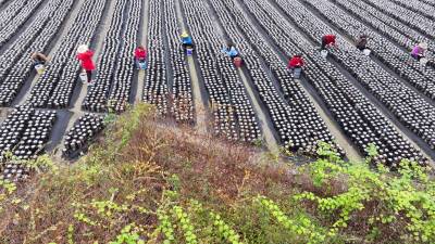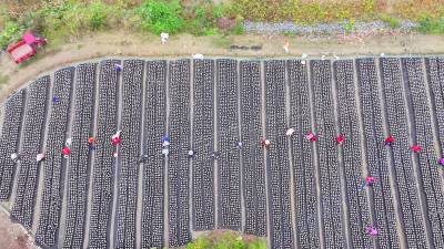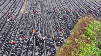2025年10月21日,十堰市房县土城镇塘埂村食用菌产业园,当地农民正在采收黑木耳。