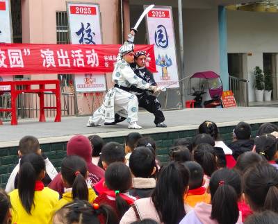 活动伊始,县戏曲传承中心的演员们便以经典湖北越调《打焦赞》选段拉开帷幕。一上场,饰演杨排风的年轻演员就以其旋转如飞的棍花技艺,演绎出杨排风的飒爽英姿,赢得了全场雷鸣般的掌声。展演现场,生、旦、净、末、丑行当齐全,文戏武戏交相辉映。演员们身着精致戏服,以婉转的唱腔、细腻的身段,将角色情感演绎得淋漓尽致,地道的乡音瞬间拉近了与师生的距离。台下掌声、喝彩声此起彼伏。