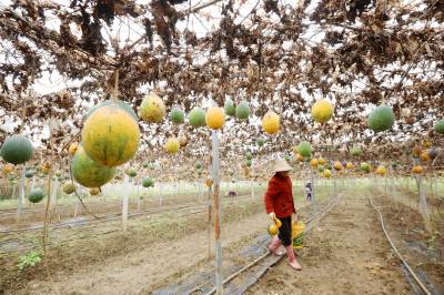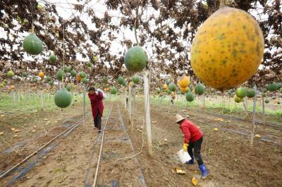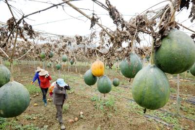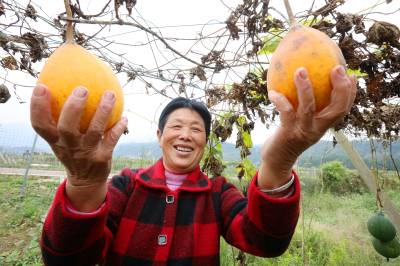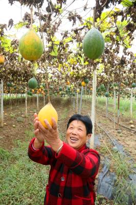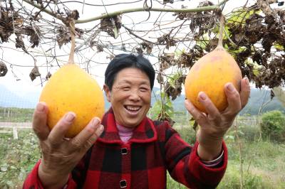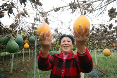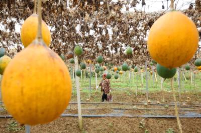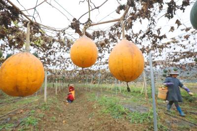 2025年10月22日,十堰市房县军店镇中村中药材产业园,当地农民正在采摘吊瓜。