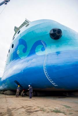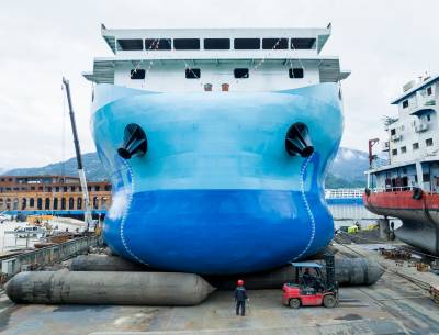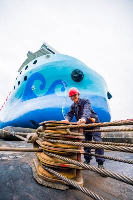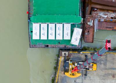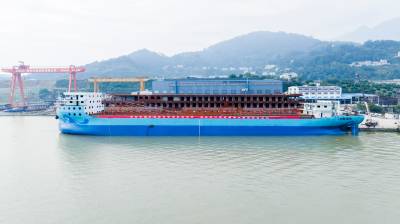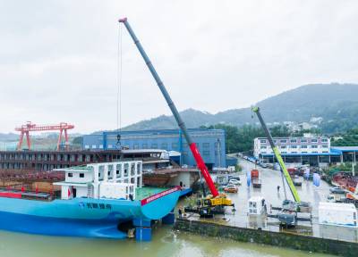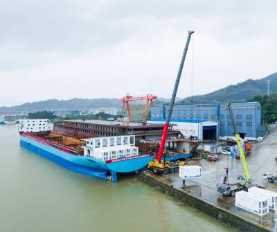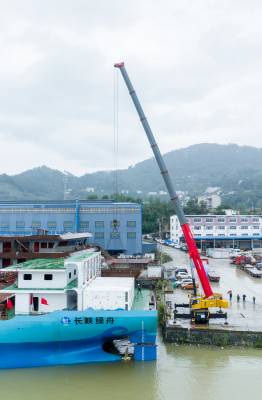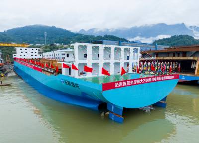 湖北秭归:全球最大万吨级纯电动运输船下水舾装