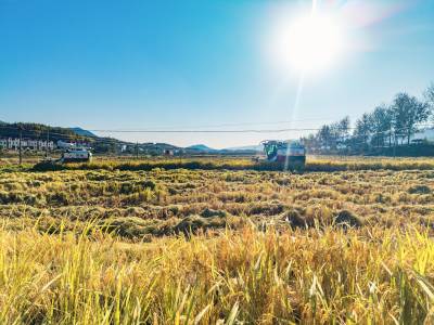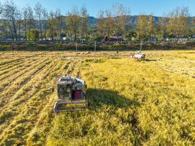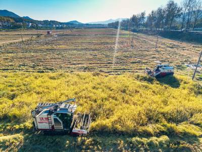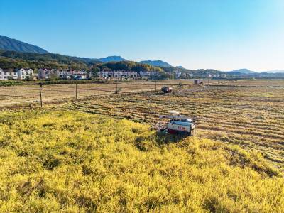 2025年10月23日,湖北省黄冈市英山县石头咀镇凉亭村,农户抢抓晴好天气收割水稻,确保颗粒归仓。