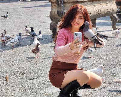 10月24日,武汉市天气晴好,江岸区古德寺上百只和平鸽与市民游客互动,吸引了他们喂鸽食忙打卡。
