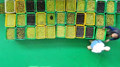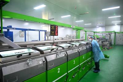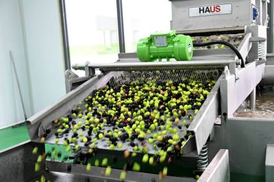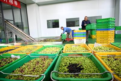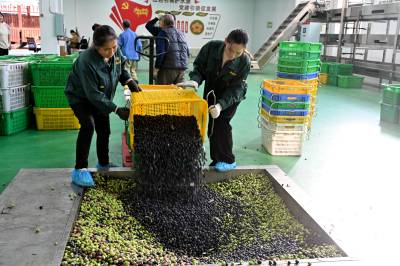 10月28日鑫榄源油橄榄2025年新油开榨,工人将今年新采收的橄榄鲜果送上全自动生产线加工橄榄油。视界网王涛摄