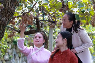 英山县杨柳湾镇东冲河村大力发展具有山区特色的种植业,春有绿茶香,夏有西瓜甜,秋有东、南瓜,冬有猕猴桃,带动了农民发家致富,促进了乡村振兴。2025年10月31日,村干部在村办的猕猴桃园查看果子成熟度,准备开园采摘。