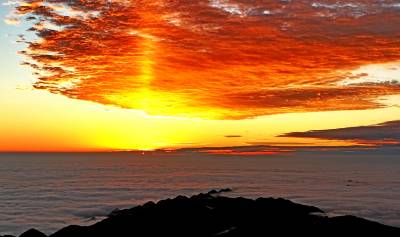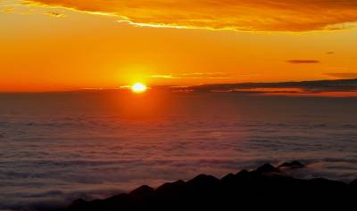 就在这辉煌的顶点,一抹异样的亮色从地平线下迸射而出——太阳要来了,漫天霞光突然安静下来,从奔放的红转为庄严的金,仿佛在为君王的降临屏息。霞光以不可阻挡之势席卷苍穹,骤然“燃烧”起来,并逐步达到顶峰。