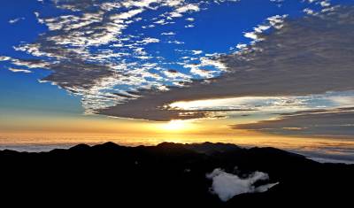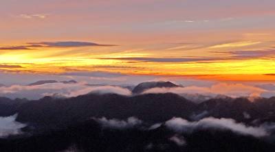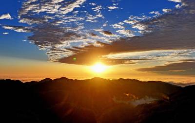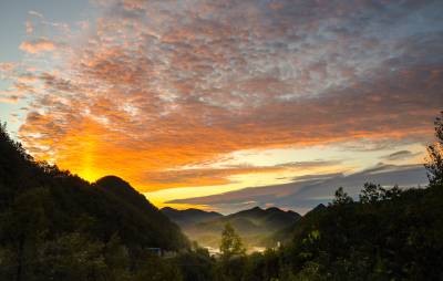 当日清晨6点,雨后的天空碧空清新,星星闪烁。站在海拔1260米的主山寨民宿处,无人机指向东方,天边还是一片沉静的鱼肚白,东方像蒙着层半透明的纱。那白慢慢泛出青光,仿佛一块巨大的玉石在缓缓苏醒。这时,第一抹红悄悄探出头来——是极淡的胭脂色,羞怯地染在天地相接处:这抹胭脂渐渐化开,变成温柔的橘粉,像画家用最软的笔蘸着朝露轻轻渲染,云朵的边缘被勾勒出金线,细得如同母亲缝衣时抽出的丝。可这温柔很短,橘粉突然浓烈起来,成了玫瑰金,大朵大朵地铺展开来。