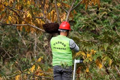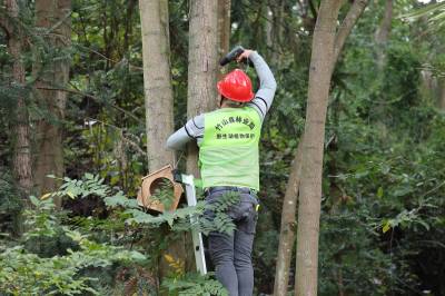 活动现场,县林业局野保站工作人员与志愿者们分工协作,穿梭于林间安装鸟巢。这些鸟巢堪称鸟类的“个性化住宅”:针对山雀设计的精致“单间”小巧玲珑,为喜鹊等中型鸟类打造的“套房”宽敞舒适,专为“鸟中仙子”白鹭定制的开放式“别墅”更是贴合其栖息习性。工作人员小心翼翼地将鸟巢固定在树枝高处,每一个动作都饱含对鸟类的关怀。