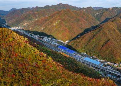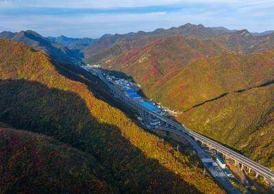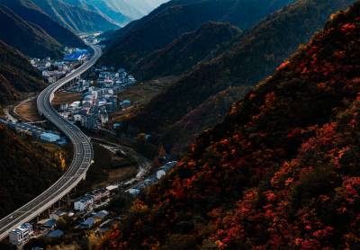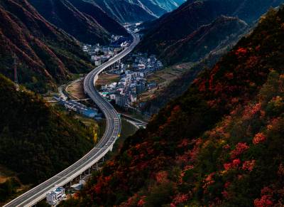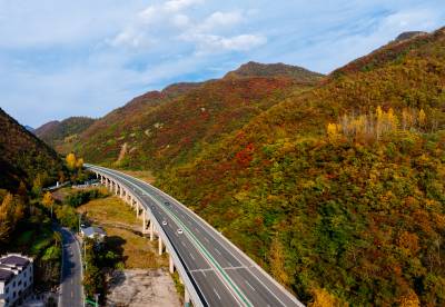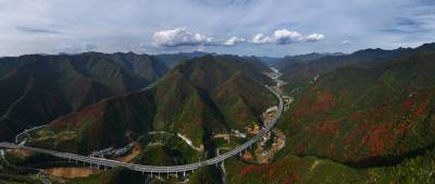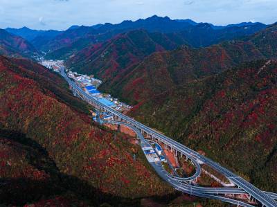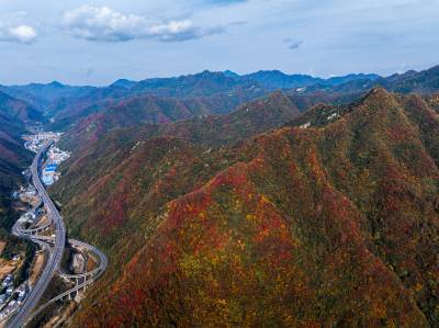 11月2日,竹山县双台乡万山丛中,黄栌树、枫树、槭树、黄楝树等落叶树的叶子由绿变黄、变红、变褐,夹杂在常绿树木之间,将山体染成五彩画卷。登高远眺,G242国道与十巫(十堰-巫溪)高速如两条黑丝带结伴穿行于层林尽染的群山。车流如梭,在五彩的秋色中“绘”出“路在景中、景随路延”的生态交通新图景。