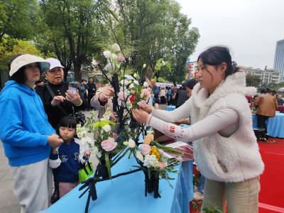 10月31日下午,武汉市江汉区新华街第二届“匠心杯”花艺技能竞赛,在省供销大厦楼下的十颗树广场举行。本次活动由江汉区总工会、新华街道工委办事处主办,街道工会联合会、单洞社区、循礼社区协办,长江日报出版发行公司、武汉晚报编辑部承办。该活动以“匠心筑美”为主线,吸引了辖区企业职工、社区居民、新业态从业者及劳模代表等同台展艺。他们在这场创意与技艺的较量中同台竞技、各展所长,以花为媒,巧妙融合传统花艺技法与现代美学理念,通过独具匠心巧思妙想成为一件件兼具艺术观赏价值与生活实用功能的精美作品。娅琦等14家参赛花店围绕“绿色生活·美好家园”主题,在20分钟内完成花艺装置创作。最终,通过居民现场参入投票,娅琦花店获得一等奖,七色花鲜花店和宇凡花卉获得二等奖,馨香花行、武汉池莉花艺、需之供应链获得三等奖。