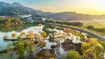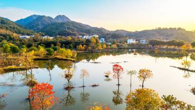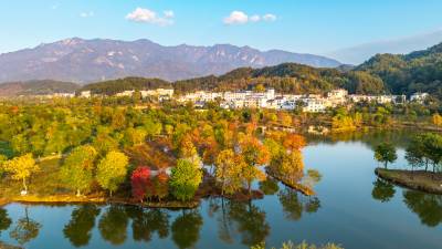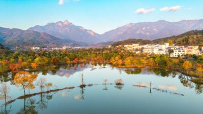 2025年11月4日,湖北省黄冈市罗田县九资河镇河西畈村,连绵的群山、错落有致的民舍、多彩的水上红叶交相辉映,美不胜收,构成一幅靓丽的秋日山乡生态画卷。