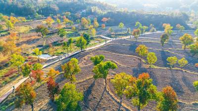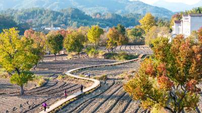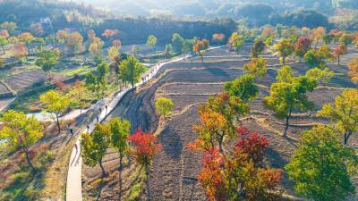 2025年11月4日,湖北省黄冈市罗田县徐凤冲村田间地头乌桕树叶万紫千红,乡村休闲游的游客在田间漫步,构成一幅美丽的和美乡村生态画卷。近年来,湖北省罗田县践行“绿水青山就是金山银山”理念,持续加强美丽乡村建设,优化生态环境和人居环境,打造生态宜居的和美乡村,并依托罗田九资河红叶带独特的生态资源优势,大力发展乡村旅游,让广大群众在乡村振兴中享有更多获得感、幸福感。