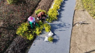 2025年11月4日,十堰市房县马栏河城区高碑段,施工人员正在绿化鄂西北地区县级最大的河道堤防工程。