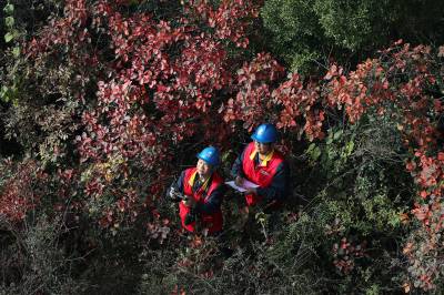 2025年11月5日,在湖北省荆门市东宝区栗溪镇山林间,国网荆门供电公司栗溪供电所运维人员应用 “无人机巡检+人工巡视”协同模式,对±800千伏特高压金塘线电力通道展开森林防火排查。