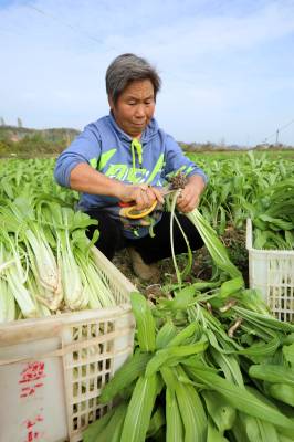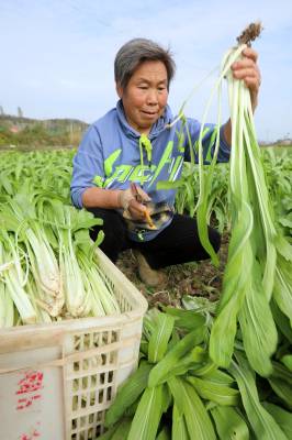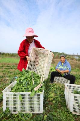2025年11月14日,十堰市房县红塔镇六谷村露天蔬菜基地,当地农民在收获时令新鲜蔬菜。