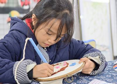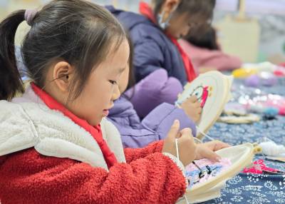 活动室内,学生们神情专注,绣制简单图案,有的绣出可爱小动物,有的毛线勾勒出美丽花朵,每一针都饱含对刺绣艺术的热爱。“参加刺绣社团后,我学会了好多针法,现在能自己绣简单图案的手帕送给妈妈,特别有成就感。”学生田如琰高兴地说。