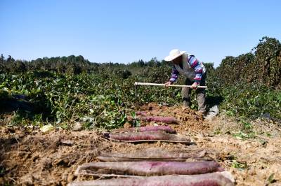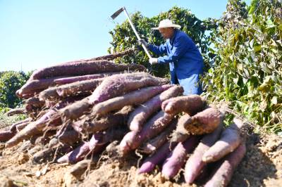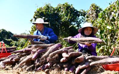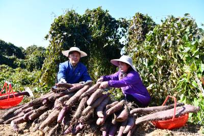 2025年11月19日,在湖北省咸宁市通城县关刀镇春雷村阳光生态农业园紫山药基地,村民忙着采挖、去土、分选紫山药,一派丰收景象。 春雷紫山药基地由当地返乡创业人士吴三龙采用“公司+基地”模式,通过浅生槽技术让山药平行生长,极大提升了采收效率。今年喜获丰收,亩产可达5000斤,让基地亩收近万元,通过务工就业、技术传授,成为当地带动就业、促进共富的“金疙瘩”。