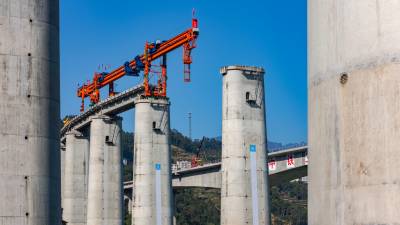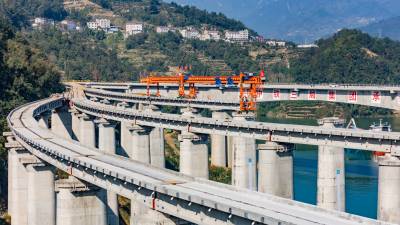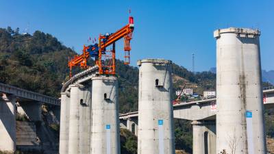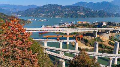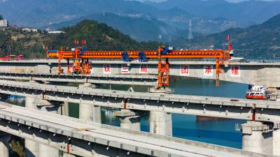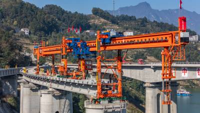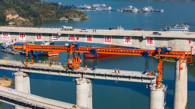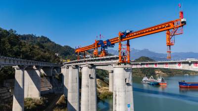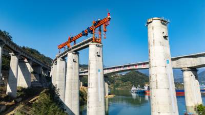 2025年11月21日,湖北省宜昌市秭归县三峡枢纽茅坪港疏港铁路建设工地上,工人们正在进行T梁架设作业。