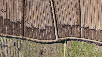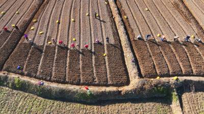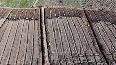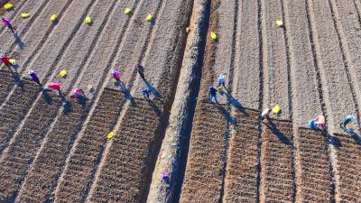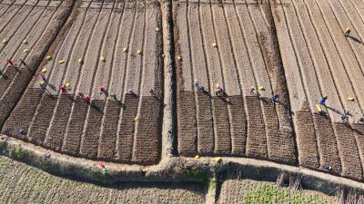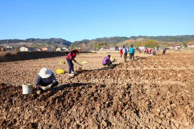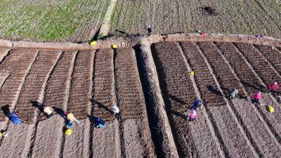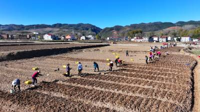 2025年11月21日,十堰市房县军店镇军马村特色产业基地,来自当地50多名留守农民在产业基地务工。图为起垄、挖窝,种植中药材百合。