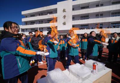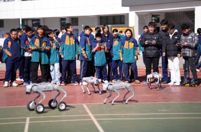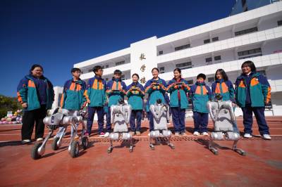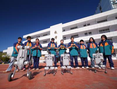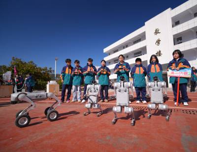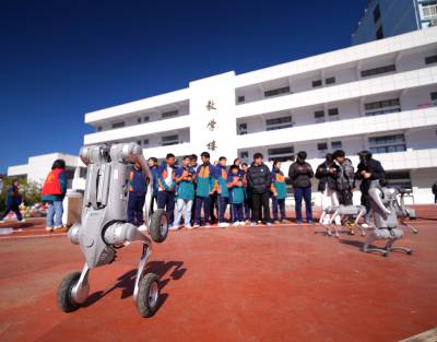 2025年11月25日,湖北省恩施土家族苗族自治州巴东县第三高级中学校园内,学生们正兴致勃勃地操作智能机器狗,体验趣味掌中火焰试验,在动手实践中感受科技的独特魅力。