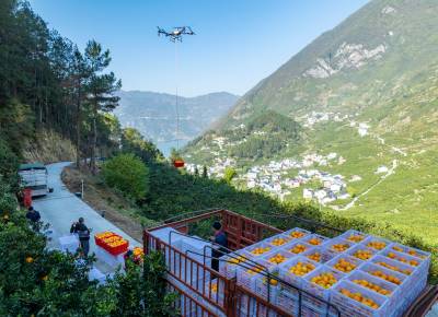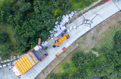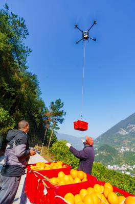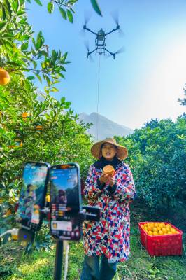 11月28日,橙农在宜昌市秭归县归州镇万古寺村用无人机转运脐橙装车外运,电商在现场直播带货。